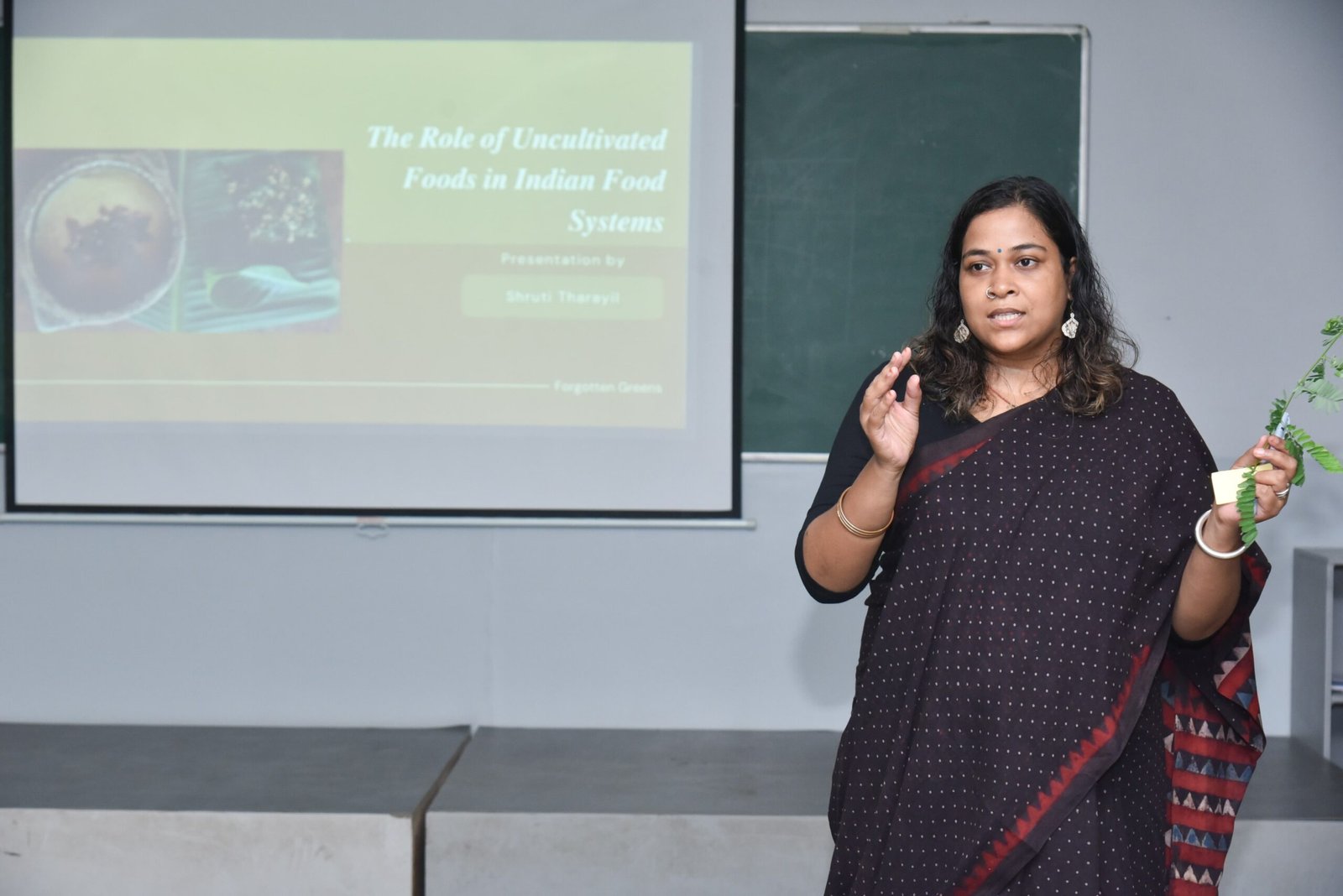 The Wild Food Talk by Ms. Shruthi Tharayil provided an insightful session on identifying edible plant species in the wild, engaging 40 participants, including students, faculty, and external guests. The session emphasized sustainable foraging practices, encouraging participants to explore nature’s abundance while respecting ecological balance. Attendees gained practical knowledge about distinguishing edible wild plants and their nutritional benefits, enhancing their understanding of biodiversity and traditional food sources.